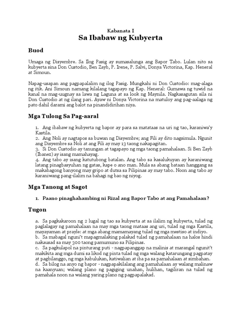 Ang bagal tuloy ng takbo ng makina. El Filibusterismo Tanong at Sagot. Lahat ay tumingin at lumapit para makinig Walang dapat gawin kundi isang kanal mula sa pagpasok ng ilog hanggang sa paglabas na maglalagos sa Maynila.