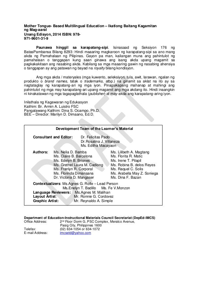Examination in mother tongue by leijulia. Dito rin magkakaroon ng kaalaman para mapaunlad ang bawat sarili at pagkatao Batayang Konseptwal Input - Nilalayong mapaunlad ang kaalaman ang mga estudyante sa paaralan tungkol sa paggamit ng Mother Tongue. 3 Mother Tongue Kagamitan ng Mag-aaral Ang kagamitan sa pagtuturong ito ay magkatuwang na inihanda at sinuri ng mga edukador mula sa mga publiko at pribadong paaralan kolehiyo at o unibersidad.