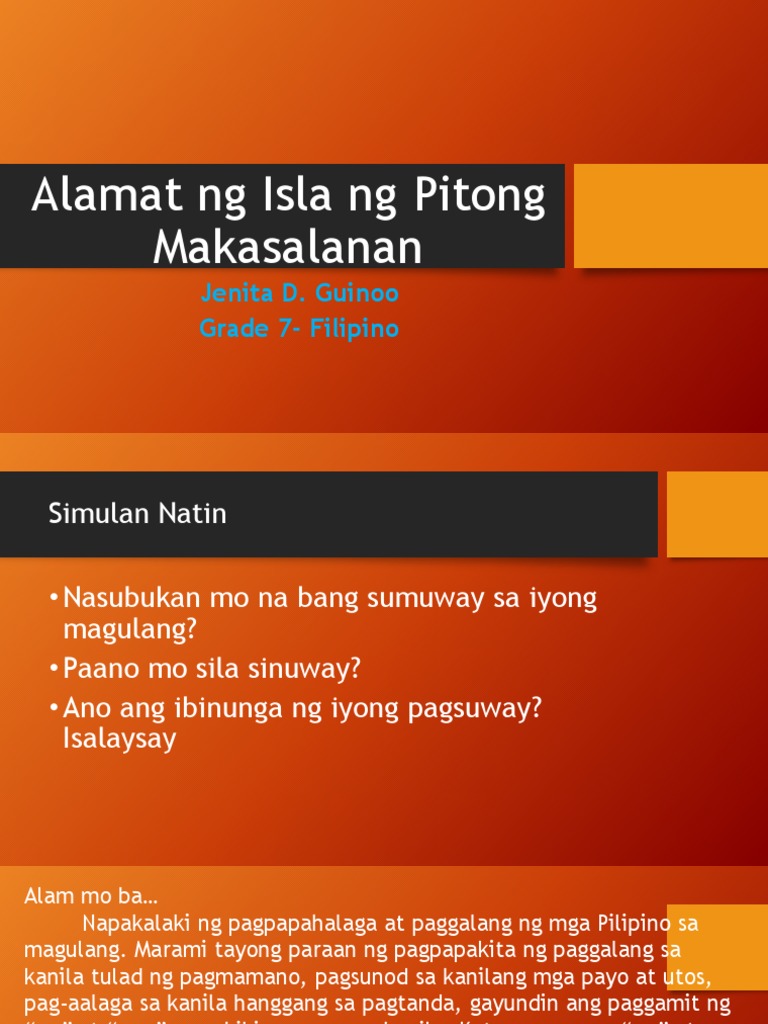 Alamat ng inyong bayan lugar 2. ALAMAT legend Ingles legendus Latin upang mabasa ALAMAT kultura ng mga Pilipino nagsimula ALAMAT Nagsasalaysay ng di-karaniwang pangyayari totoong naganap Kaugnay ng pagkakaroon ng mga bagay lugar at pangyayaring may kaugnayan sa mga engkantada multo demonyo at mga katularing nilalang. Sa murangedad lahat ng bagay na makita nya at mahawakanay alam niya.