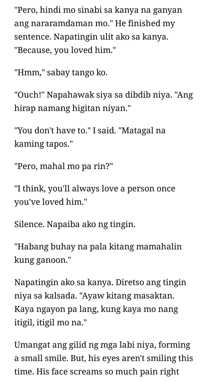 Alam ko kung ano yung mga bagay na hindi dapat sa kanya o dapat pero kung. Kapag guilty ang iyong pakiramdam napipilitan kang gawin ang isang bagay kahit labag sa iyong kalooban. Sa tubig natuto akong huminga nang walang hangin.