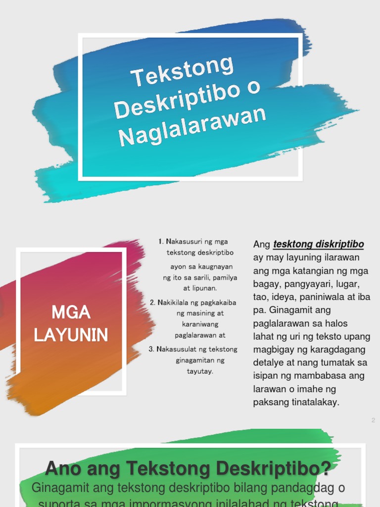 Sa Tekstong Deskriptibo kahit hindi ka pintor ay makakabuo ka. ANG TEKSTONG DESKRIPTIV Ito ay may layuning maglarawan ng isang bagay tao lugar karanasan sitwasyon at iba pa. Ang tekstong ito ay laging sumasagot sa tanong na Ano.